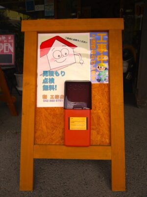 看板中央のポストには、当社の施工例やご案内を掲載したチラシをご用意しております。